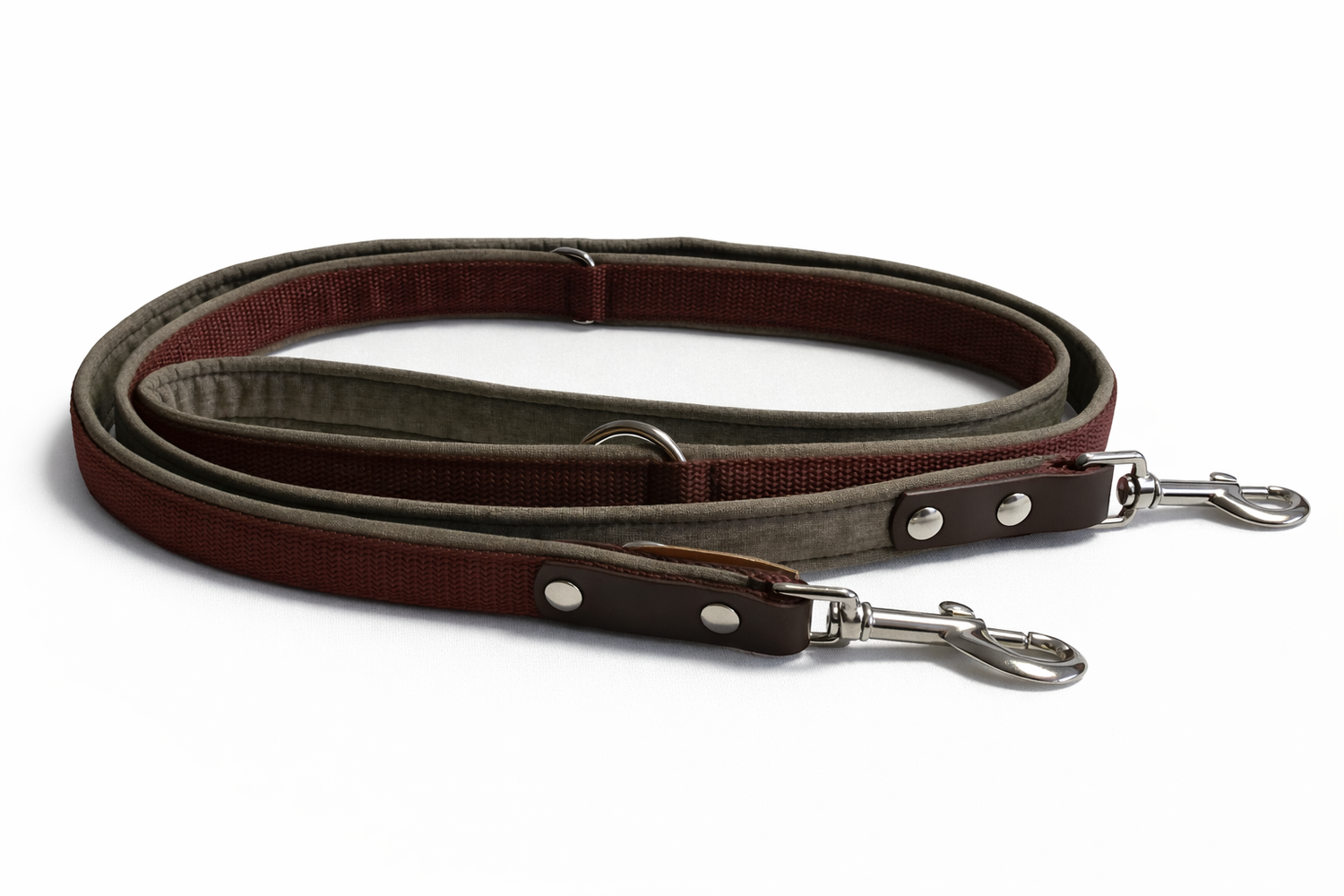 Diese handgemachte Hundeleine passt perfekt zu deinem Halsband oder Geschirr und kombiniert stabile Führung mit angenehmem Griff. Das zugfeste Gurtband wird mit weichem Softshell gepolstert – so liegt die Leine auch bei längeren Spaziergängen komfortabel in der Hand.